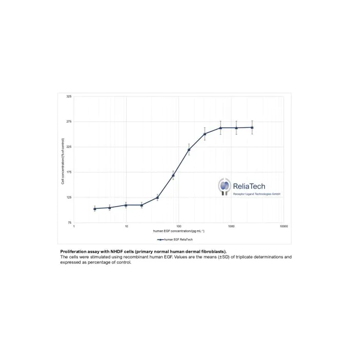 Epidermal growth factor (EGF) is the founding member of the EGF family that also includes TGFα, amphiregulin (AR), betacellulin (BTC), epiregulin (EPR), heparin-binding EGF-like growth factor (HBEGF), epigen, and the neuregulins (NRG) 1 through 6. Members of the EGF family share a structural motif, the EGF-like domain, which is characterized by three intra-molecular disulfide bonds that are formed by six similarly spaced conserved cysteine residues. All EGF family members are synthesized as type I transmembrane precursor proteins that may contain several EGF domains in the extracellular region. The mature proteins are released from the cell surface by regulated proteolysis. The 1207 amino acid (aa) human EGF precursor contains nine EGF domains and nine LDLR class B repeats. The mature protein consists of 53 aa and is generated by proteolytic excision of the EGF domain proximal to the transmembrane region. Mature human EGF shares 70% aa sequence identity with mature mouse and rat EGF. EGF is present in various body fluids, including blood, milk, urine, saliva, seminal fluid, pancreatic juice, cerebrospinal fluid, and amniotic fluid. Four ErbB (HER) family receptor tyrosine kinases including EGFR/ErbB1, ErbB2, ErbB3 and ErbB4, mediate responses to EGF family members. EGF binds ErbB1 and depending on the context, induces the formation of homodimers or heterodimers containing ErbB2. Biological activities ascribed to EGF include epithelial development, angiogenesis, inhibition of gastric acid secretion, fibroblast proliferation, and colony formation of epidermal cells in culture.